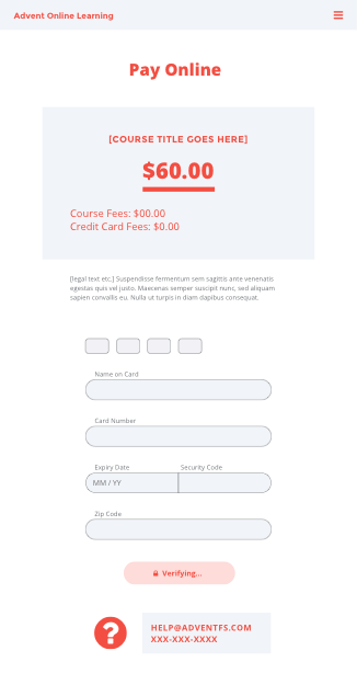 For course students, the process was more involved. To complete the course, they had to register, take the course, and pay for the course. Payment could be made at any time and through three different payment methods (online, by mail, or by phone). The order of operations here was confusing to people, because normally you can't access materials until you pay for them, but that's not the case here. I chose to make the process imitate a standard payment gateway as much as possible, going from registration to payment to the course. But to allow students to get to the materials right away, I directed students straight to the course page after instructing them how to pay. This has some clear benefits: